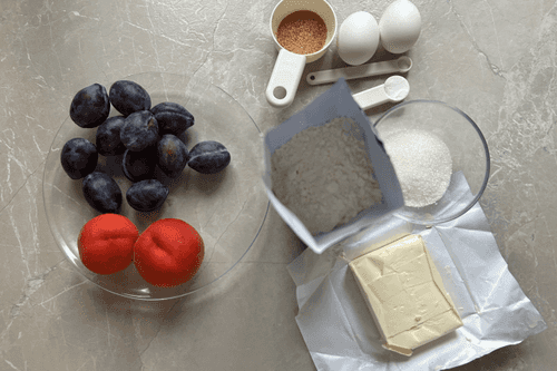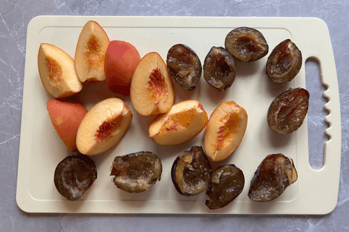 Slice the plums and peaches.