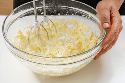 Beat room temperature butter and 100 grams of powdered sugar until pale.