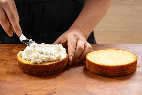 Cut the cooled cake layer, spread with cream, and stack on top of each other. Place in the fridge for 20 minutes (or in the freezer for 10) to let the cream set and make it easier to work with the cake.