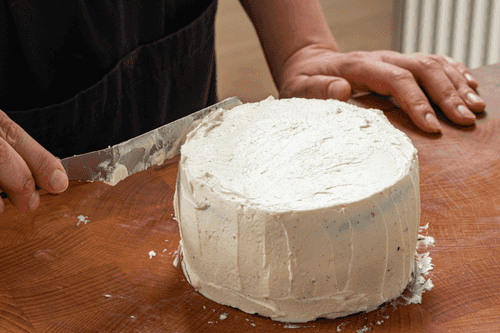 Also cover the cake with cream on the sides. Send the cake back to the fridge for 20 minutes.