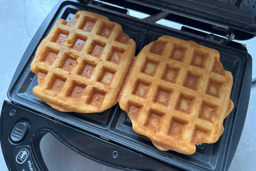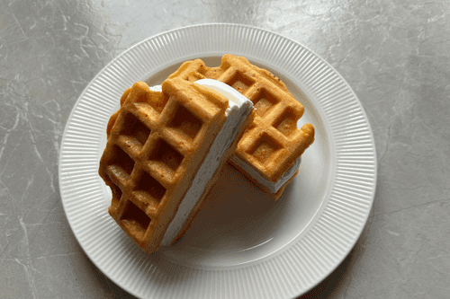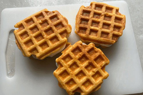 Glue the waffles in half and let the mousse set in the refrigerator for 30 minutes.