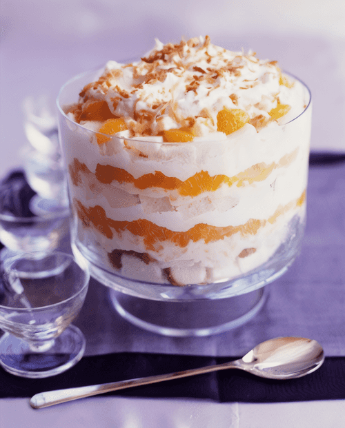 In a serving dish of about 2 liters, layer panettone cut into thin slices to cover the bottom, then a layer of candied fruits, followed by brandy cream and a thick layer of whipped cream. Chill.