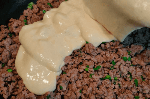 Pour the prepared dough over the minced meat.