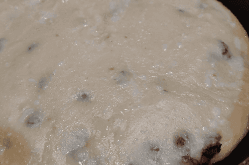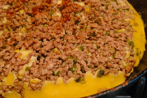 Flip the pie using a lid or plate and place it back in the pan, meat layer facing up. Cook for another 10 minutes.