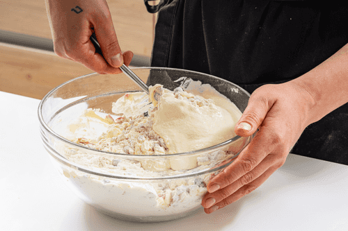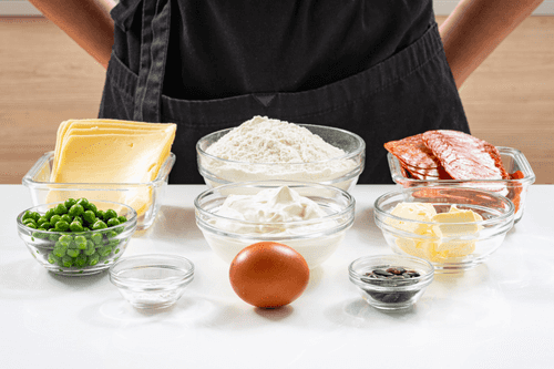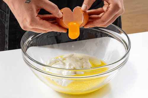 Melt the butter and let it cool. In a bowl, combine the butter, egg, sour cream, a pinch of salt, and pepper. Mix thoroughly with a whisk.