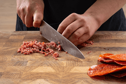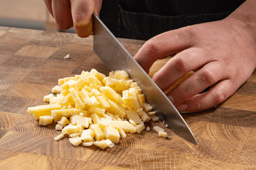 Cut the sausage into small cubes (the smoked one should be cut as small as possible).
