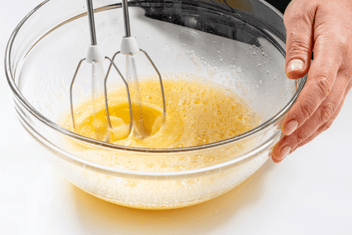 In a large bowl, beat the eggs with salt and sugar until light foam forms.