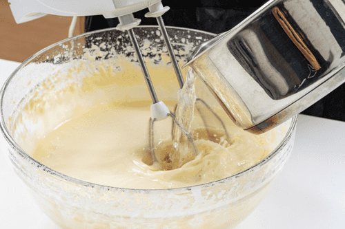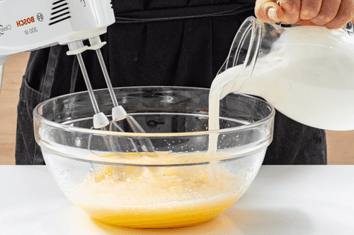 Add the sifted flour in parts, mixing well to avoid lumps.
