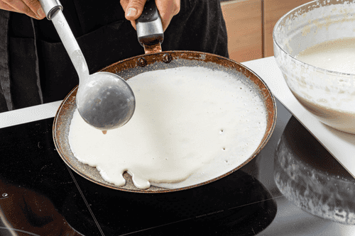 Heat the frying pan well, optionally grease the bottom with oil, and pour a ladle of batter onto it, spreading it evenly across the surface. There is no need to constantly stir the batter before pouring it into the pan.