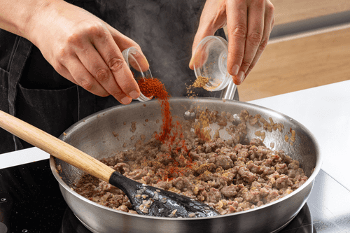 Add minced meat to the vegetables. Fry on high heat for 5 minutes. Reduce the heat, add salt and pepper, sprinkle with coriander and paprika, and fry for another 7-10 minutes.
