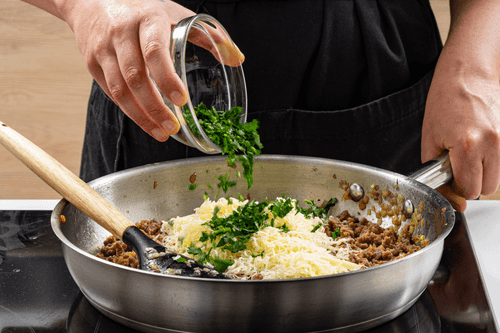 At the end, add parsley and grated cheese, heat well. Remove the pan from the heat and let the filling cool.
