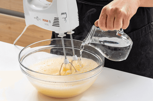 Whisk the eggs with sugar and 0.5 teaspoon of salt until frothy. While continuing to whisk, pour in 1 cup of boiling water.