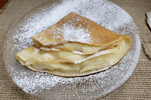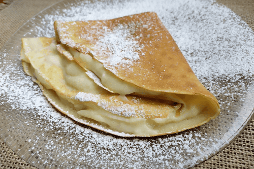Spread custard on half of the pancake, cover with the other half, fold in half as shown in the photo. Dust with powdered sugar.