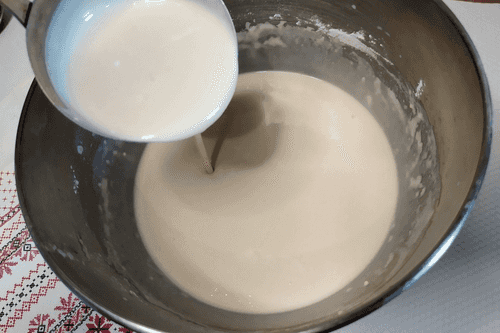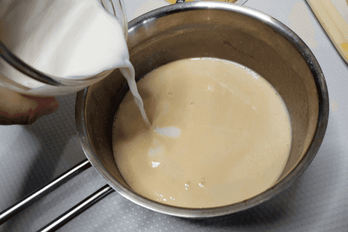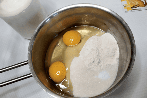 Pour 0.5 liters of milk into the egg mixture. Stir.