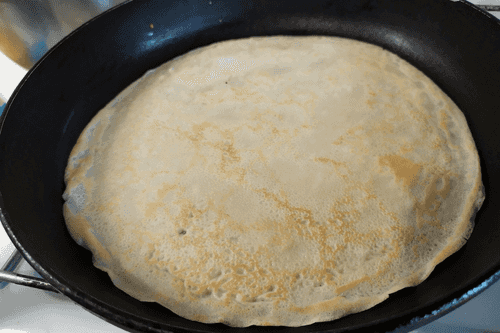 Bake thin pancakes on a hot skillet greased with vegetable oil.
