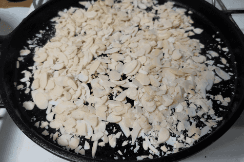 Toast almond petals (can be replaced with any other nuts) in a pan for 1-2 minutes, stirring to prevent burning.
