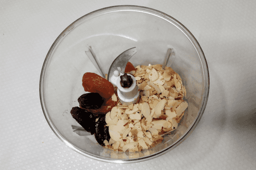 Chop dried fruits and nuts in a blender.