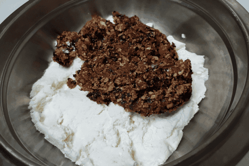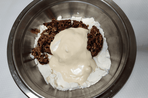Add whipped butter with condensed milk to the cottage cheese mixture. Mix thoroughly until smooth.