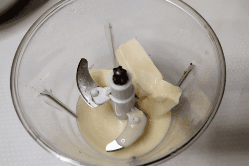 In a blender, whip the softened butter with condensed milk.