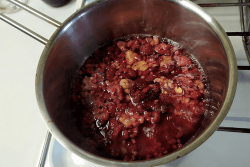Combine 150 grams of frozen raspberries, 2 tablespoons of sugar, and 50 ml of water in a saucepan.