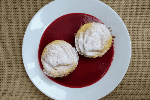 Serve ricotta pancakes with raspberry sauce, dusted with powdered sugar before serving.