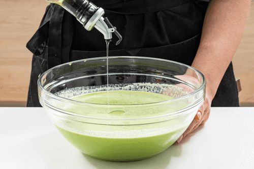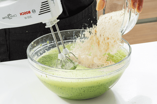Sift the flour and add it to the spinach mixture. Season with salt and mix thoroughly.
