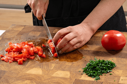 Cut the tomatoes into small cubes and chop the greens.