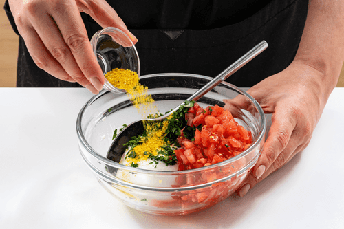 Mix ricotta with chopped tomatoes, herbs, and Adyghe salt.