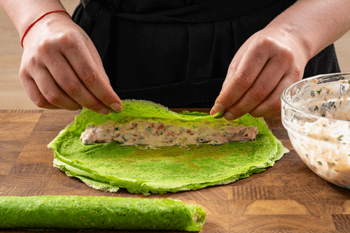 Place the filling on each pancake, spread it, and roll it up like a tube.