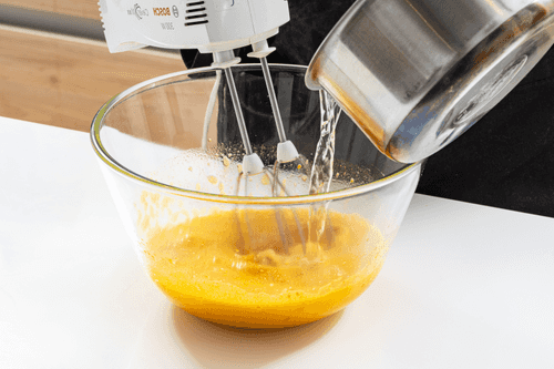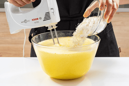 Without stopping the mixer, pour in the cold milk. Then mix in the sifted flour.