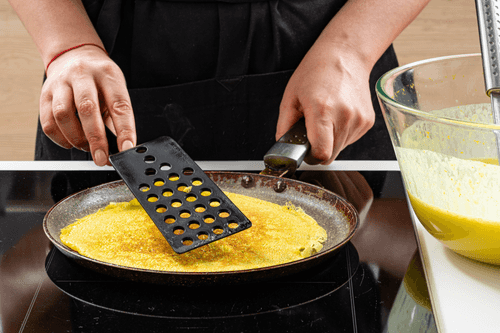 Preheat the pancake pan well, optionally grease it with a little vegetable oil, and pour in a ladle of batter, spreading it across the bottom. Fry until golden edges, then flip and cook for about 30 seconds.