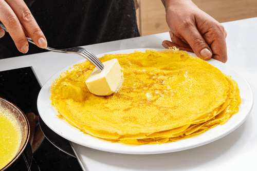Stack the ready pancakes, greasing each with butter.