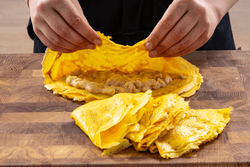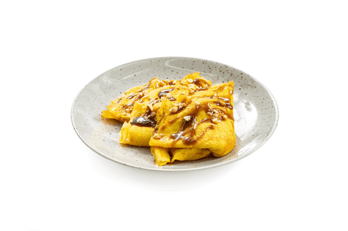 Some pancakes already have a golden hue, but this one is still distinctly yellow, which we achieved by adding turmeric to the dough. We came up with a dessert filling for these pancakes - banana with peanuts and caramel sauce.