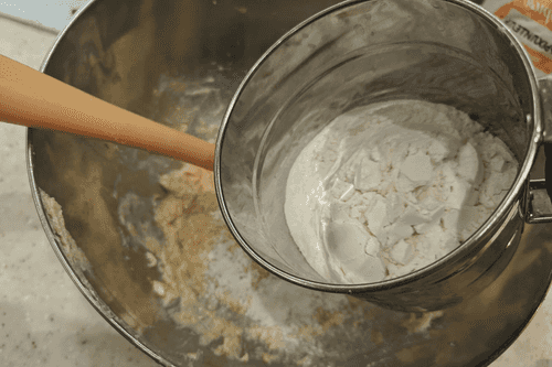 Sift the flour, gradually adding it to the butter-egg mixture while constantly stirring.