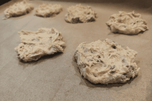 Line the baking tray with parchment paper. Use two tablespoons to form patties from the dough and place them at a small distance from each other.
