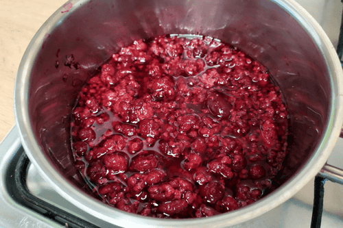 Place frozen raspberries in a saucepan, add 1 tablespoon of sugar and 50 ml of water. Cook for 7-10 minutes.