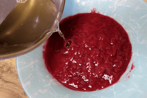 Blend the raspberries until smooth, then strain through a sieve to remove the seeds.