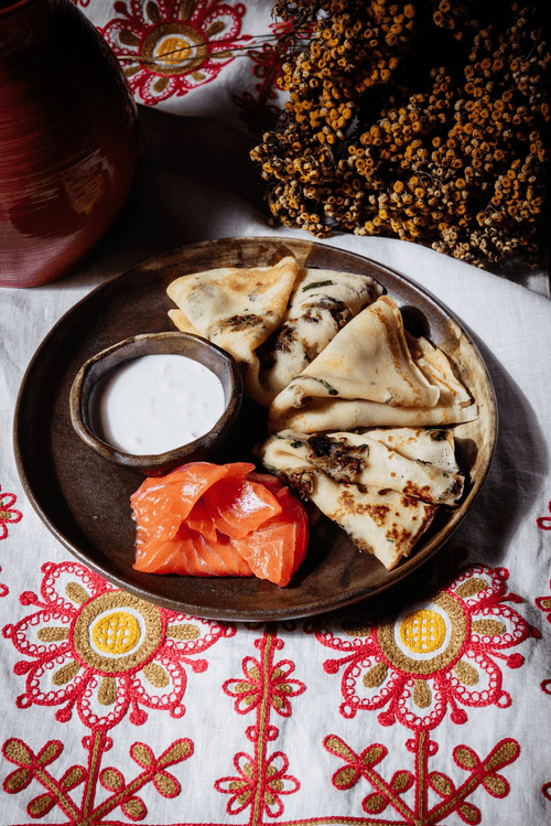 Pancakes with toppings and trout