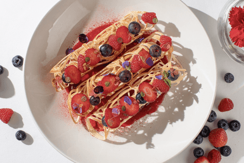 Layer the decorated pancakes rolled into tubes on top. Garnish with berries and mint.