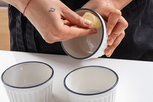 Grease 200 ml molds with butter and sprinkle the walls with sugar (50 g). Place the molds on a baking tray.