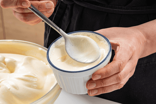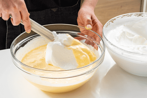 Introduce a little whipped egg whites into the yolk mixture, then gradually fold in the rest to achieve a uniform but airy consistency.