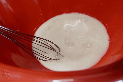 In 1 cup of warm milk, add 100 grams of sugar and 6 grams (about 1.5 teaspoons) of yeast. Stir with a whisk.