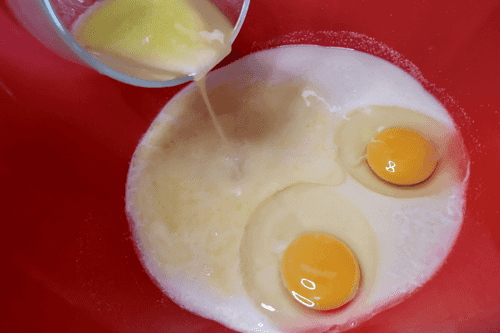 Break 2 eggs and pour in melted butter cooled to room temperature.