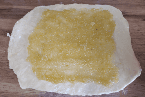 Spread the lemon filling, leaving a gap from the edge of the dough.