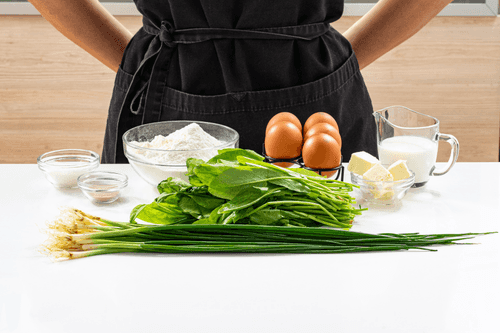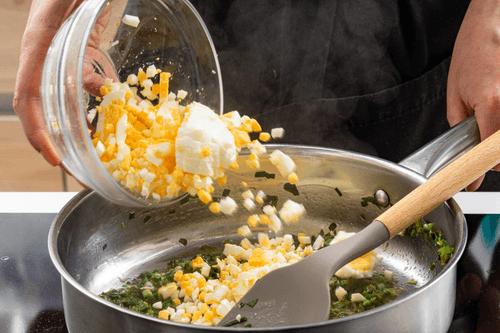 Melt the remaining butter in a pan. Quickly sauté the sorrel and green onions over high heat. Add the eggs and let cool. Season to taste.