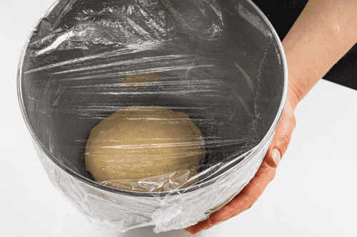 Cover the dough with plastic wrap and place it in a warm place for 1.5 hours.