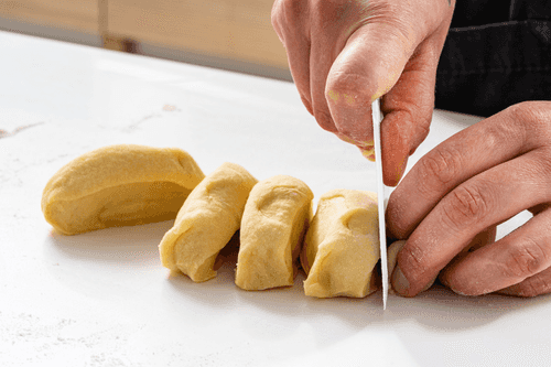 Knead the dough, dust the table with flour, roll it into a sausage, and divide it into equal parts.