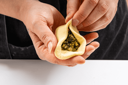 Roll or flatten the dough into a round pancake, place the filling on it, and tightly pinch the edges.