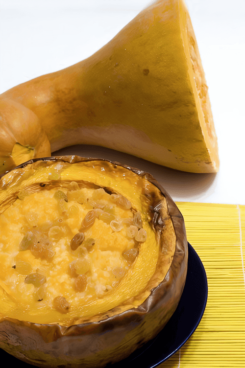 Pumpkin-rice pudding is a refined and cozy dish of American cuisine that combines the tenderness of rice, the sweetness of pumpkin, and the aroma of spices. Its roots trace back to autumn holiday traditions when pumpkin becomes the main ingredient in desserts. The velvety texture of the pudding infused with nutmeg, cinnamon, and cloves makes it an ideal choice for cool evenings. The thick creamy consistency reveals the soft sweetness of pumpkin while apple puree adds a subtle fruity note. This dessert can be served chilled, garnished with cinnamon and fresh mint, giving it a special aroma and elegant appearance. It pairs perfectly with a cup of hot tea or coffee, creating an atmosphere of comfort and warmth.
