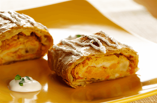 Pumpkin roll with cheese filling is a delightful dessert from American cuisine that perfectly combines the softness of fragrant pumpkin sponge cake with the tenderness of creamy cheese filling. This recipe became popular in autumn when pumpkin takes center stage in seasonal treats. Its rich flavor with hints of cinnamon and vanilla makes it an ideal complement to a cup of aromatic coffee or tea. With its airy dough and creamy filling, the roll has a pleasant texture and melts easily in the mouth. It is perfect for festive gatherings and cozy home evenings. The ability to store it frozen for several months makes it a convenient option for a pre-prepared dessert. Pumpkin roll is a harmony of taste and aroma that delights at any time of the year.